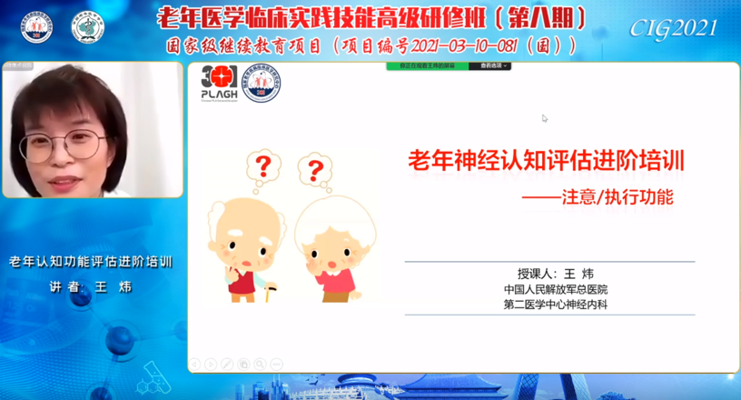 解放军总医院第二医学中心的王炜主任自2018年以来一直指导本培训班的老年认知功能筛查和评估技能的规范化培训。此次为大家带来“老年神经认知评估的进阶培训”。她指出老年认知心理评估中记忆力的评测比较常见,但是注意力的评测与执行功能的评测也非常重要。
