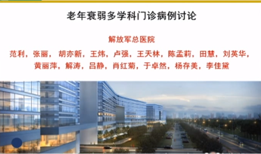 首先由解放军总医院的胡亦新、张丽、田慧、王炜、卢强、刘英华、陈孟莉、黄丽萍、肖红菊、于卓然等专家团队进行病例分享。通过该团队多学科专业基于老年综合评估,制定出一整套的管理方案,并通过随访调整方案,患者在血压、血糖、血脂的控制方面,在吞咽功能、双下肢乏力方面均有明显改善。由本病例总结,在老年衰弱多学科门诊建设中,基于老年综合评估及时启动跨学科团队会诊,高水平的专科专家给予共病管理调整多重用药、配合默契的跨学科团队工作模式和组织机制、病人和家属的支持参与,建立随访机制,都是促进老年多学科门诊能够将管理方案启动和落地,并能切实使老年人获益的要素。