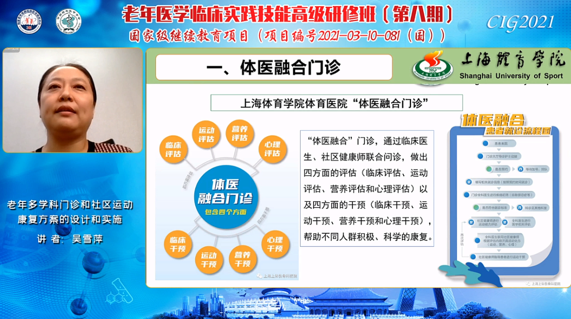 上海体育学院的吴雪萍教授从体医融合门诊、社区运动康复方案视角,分享临床医生、健身指导专家联合问诊、综合评估,并通过有资质的健身指导者和社区健康师进行运动干预,满足不同人群的健康需求。同时,吴雪萍老师还分享了“体卫融合”视域下社区长者运动健康之家,长者运动健康之家也是多学科在社区中综合应用的一种方式,是体卫融合理论成果转化地,是适老化、智慧化与数字化技术应用的示范地,是延伸体卫融合社区创新发展的探索地。通过该项目的实施,不断满足老年人对健康多层级的需求,以社区为单元助推健康关口前移,为老年人提供全方位的健康服务。