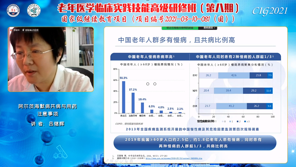 北京老年医院的吕继辉主任自2018年以来一直支持本项目,是本培训项目特色内容之一《老年认知功能障碍多学科工作坊》的主要指导专家,此次与大家分享了“阿尔茨海默病(ad)共病与用药注意事项”。她表示ad患者往往多病共存,且多重用药比例高,对此类患者应该权衡获益与风险,并考虑预期寿命。在用药方面应选用耐受性与安全性好的药物,尽量避免多重用药。