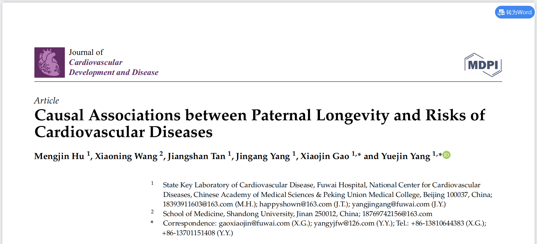1. hu m, wang x, tan j, yang j, gao x, yang y. causal associations between paternal longevity and risks of cardiovascular diseases. j cardiovasc dev dis. 2022 jul 26;9(8):233.