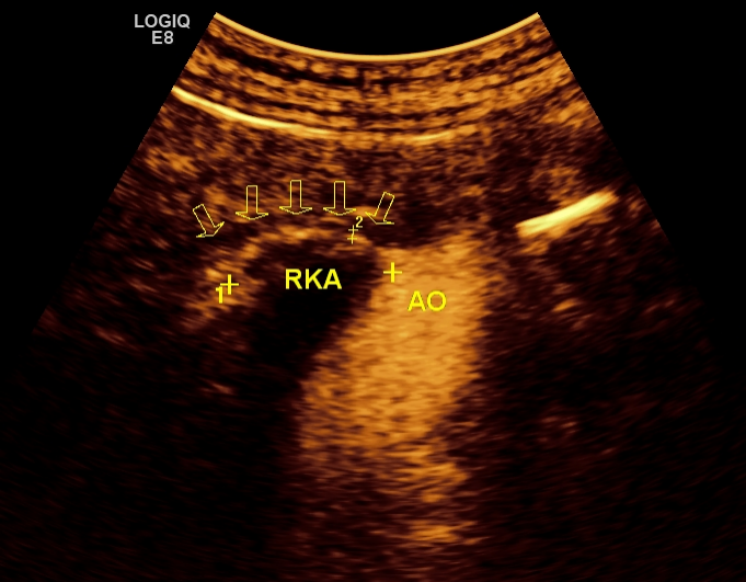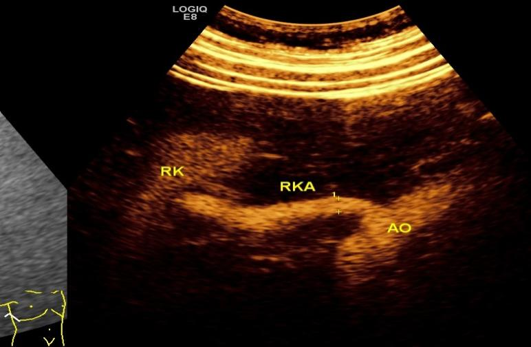 图1 超声造影:显示正常右侧肾动脉全程
