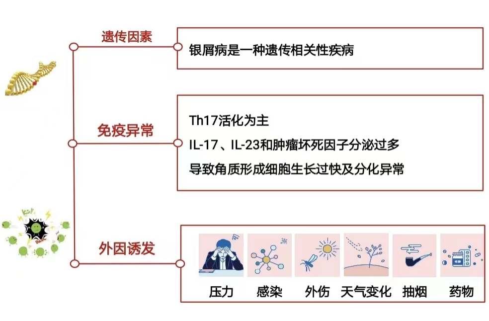 当前研究显示银屑病是遗传、环境、免疫因素共同作用诱发的一种疾病,确切病因目前尚不清楚。