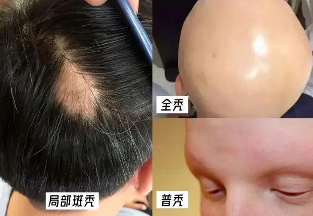 斑秃,老百姓称其鬼剃头,即突然发生的头部的圆形脱发,不疼不痒。斑秃是一种精神因素主导、自身免疫相关的非瘢痕性毛发脱失性疾病,可以继续发展融合。当所有头发都脱掉叫全秃,甚至进一步发展,眉毛、腋毛、阴毛都脱落,叫普秃。