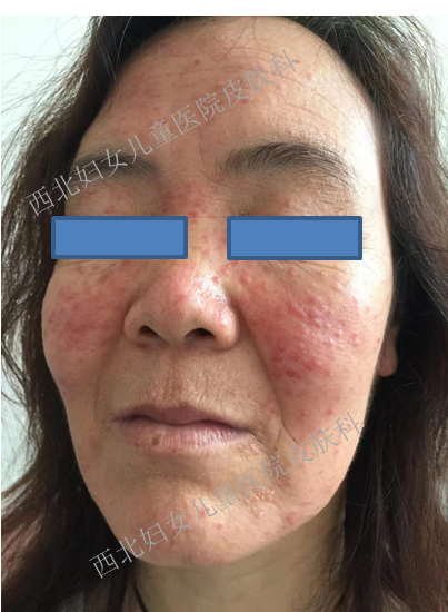 近日,门诊上来了一位神情焦躁的张阿姨(化名),一进入诊室便忧心忡忡得说着自己的情况“大夫,我的脸毁了,又红又烫还长了小疙瘩,一热还有刺痛的感觉,怎么办”。摘下口罩后我们便能看到张阿姨面部的片状红斑,间杂毛细血管扩张、丘疹、脓疱,以面颊部、鼻部、额部为著。详细的问诊后阿姨告诉我们:面部肤色黄又黑,比起姐妹没自信,无意看到小广告,面膜美白又补水,狠心囤它一百张,起初确实亮又白,越用效果越不对,脸部发红又发烫,吃辣遇热更严重,日复一日又加重,焦躁难安来就医。