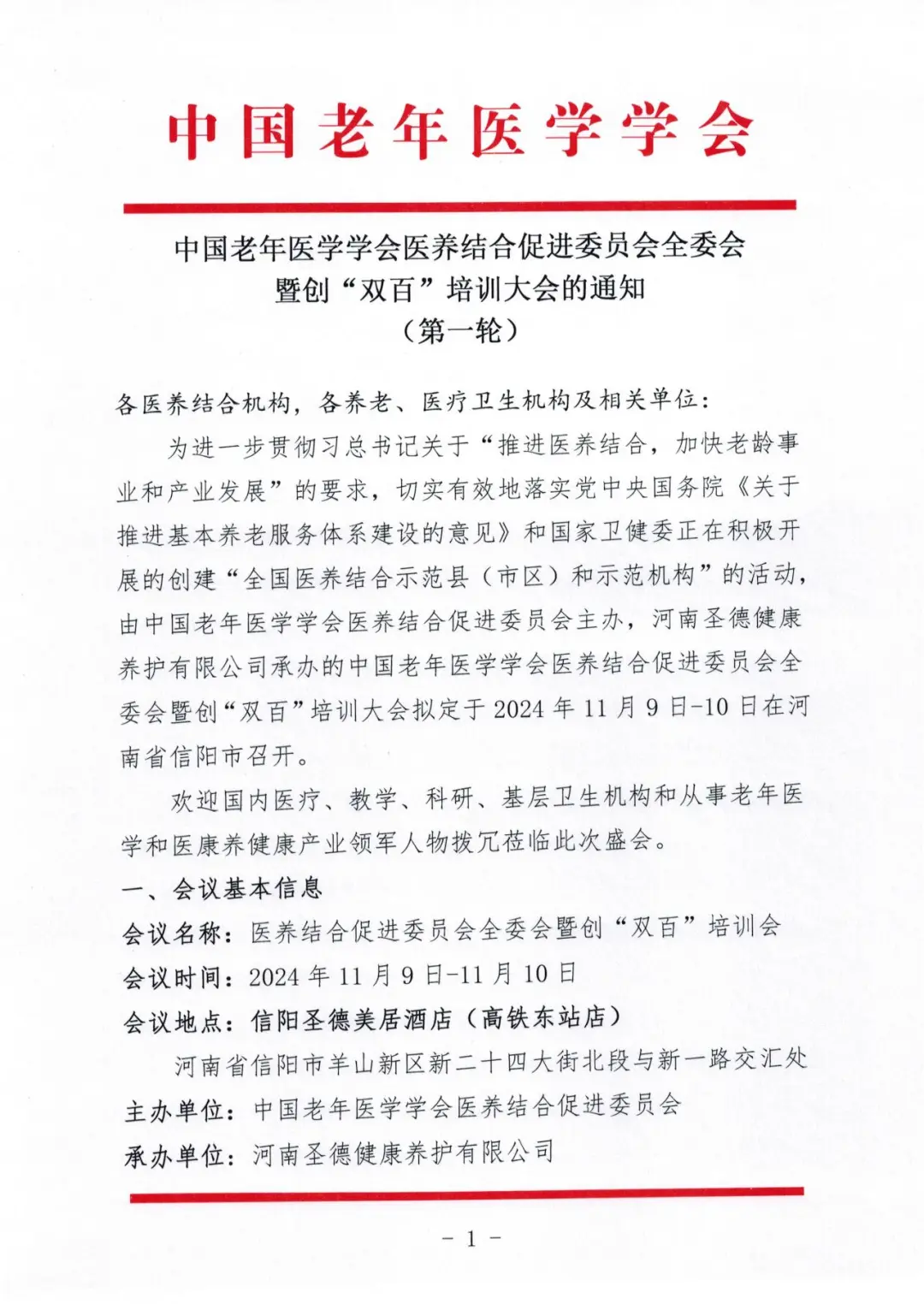 中国老年医学学会医养结合促进委员会全委会暨创“双百”培训大会的通知(第一轮) -j9九游会