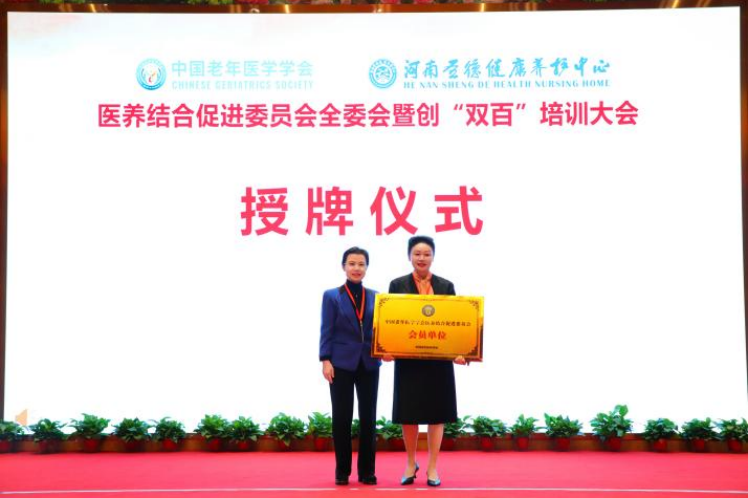 中国老年医学学会副会长兼秘书长许晓东给中国老年医学学会医养结合促进委员会会员单位河南圣德健康养护中心授会员单位牌匾。