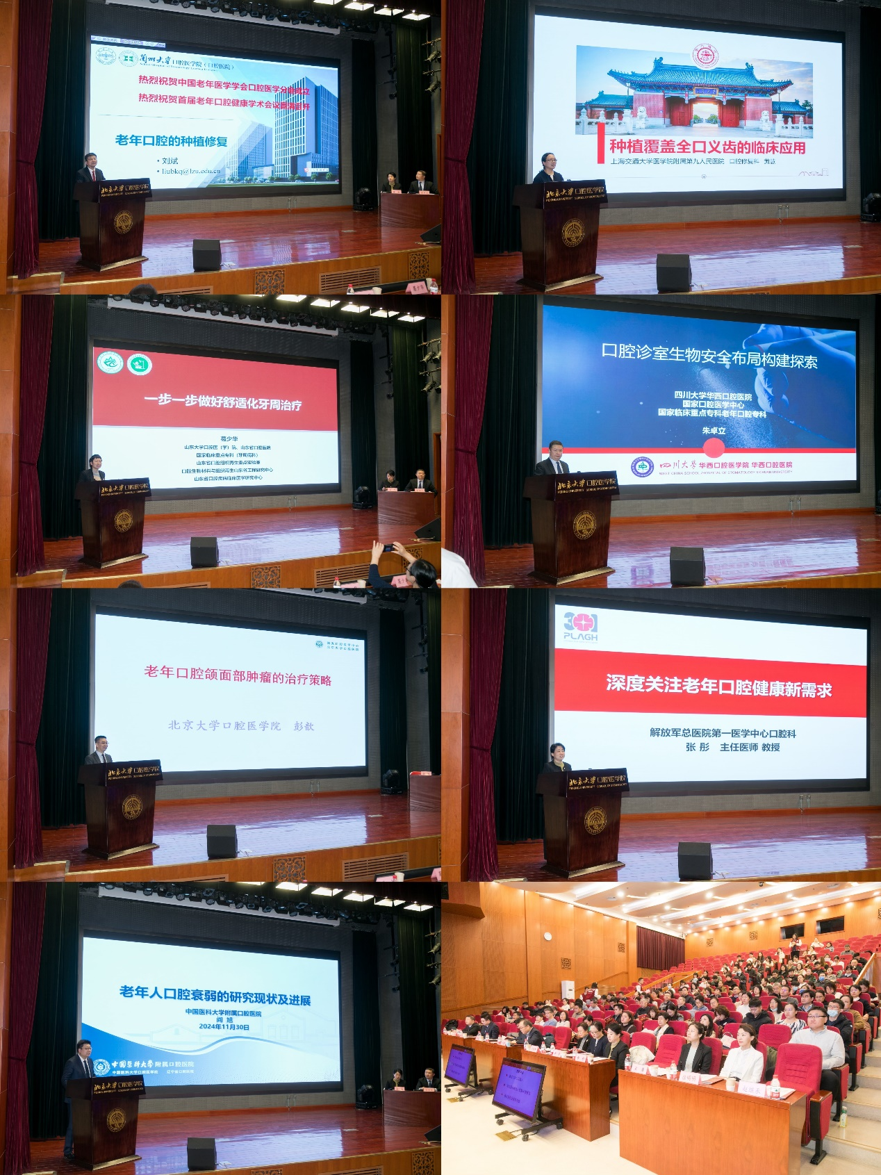 兰州大学口腔医院院长刘斌教授分享了老年口腔的种植修复方面的诊疗和研究工作;山东大学口腔医院院长葛少华教授分享了如何一步一步做好舒适化牙周治疗;北京大学口腔医院党委副书记彭歆教授分享了老年口腔颌面部肿瘤的治疗策略;中国医科大学口腔医院阎旭教授分享了老年人口腔衰弱的研究现状与进展;四川大学华西口腔医院朱卓立教授分享了口腔诊室生物安全布局构建;上海交通大学医学院附属第九人民医院黄慧教授分享了种植覆盖义齿的临床应用;解放军总医院第一医学中心张彤教授分享了深度关注老年口腔健康新需求。