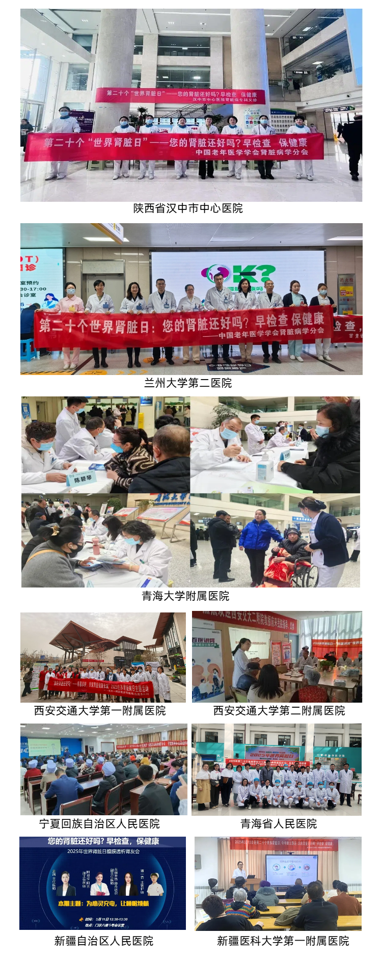 每年三月份的第二个星期四被定义为世界肾脏日(wkd)。全世界都在这一天进行相关的活动,其目的在于提高人们对肾脏病的认识,并重视慢性肾脏病的早期检测和预防。今年的3月13日是第20个世界肾脏日,主题是“您的肾脏还好吗?早检查,保健康”。中国老年医学学会肾脏病学分会积极响应“健康中国2030”规划纲领号召,以世界肾脏日为契机,倡导分会委员在全国各地结合自身条件,围绕主题开展义诊、科普宣教、肾友会等各类公益活动。陈丽萌会长介绍道,“随着我国人口老龄化的不断的发展,老年肾脏疾病的发病率正在逐渐上升;老年人由于有多种疾病,药物反应及药物代谢动力均发生病变,且往往合并有衰弱和老年综合征,导致老年肾病治疗的复杂性与特殊性。因此,做好支持治疗,早期诊断、早期治疗,减少患者及家属痛苦,改善生活质量,是治疗老年肾脏疾病的主要目标。中国老年医学学会肾脏病学分会旨在通过各类公益活动指导公众关心重视老年人肾脏健康、增强老年人肾脏病防治意识,提升老年人生活质量。”