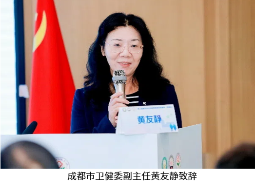 成都市卫健委副主任黄友静致辞并系统介绍成都医养结合政策发展和实践成果,强调通过资源整合与人才培养推动区域服务提质增效的重要意义。
