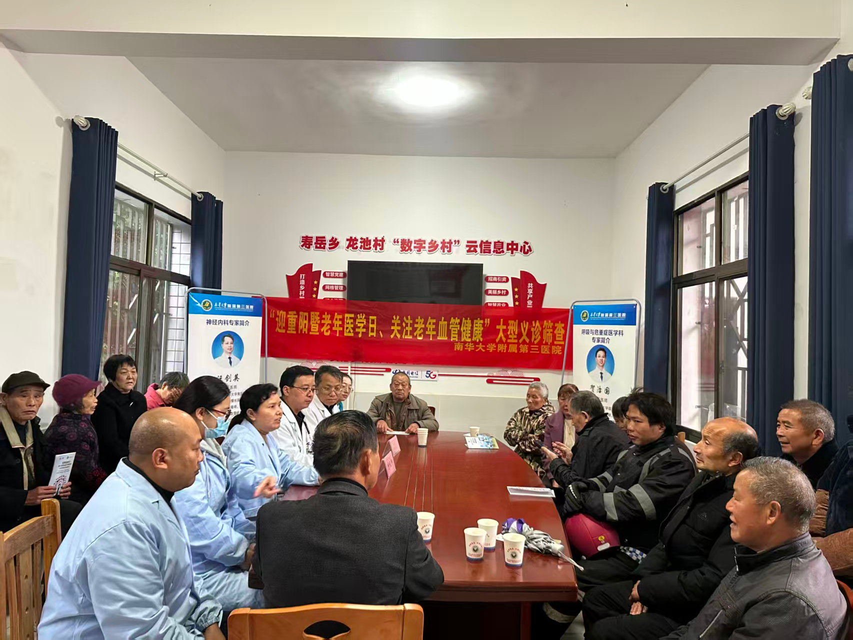 10月29日,南华大学附属第三医院联合衡阳市南岳区卫健局、寿岳乡卫生院,在寿岳乡龙池村举办“迎重阳暨老年医学日,关注老年血管健康”大型义诊筛查活动,将优质医疗资源下沉至乡村一线。