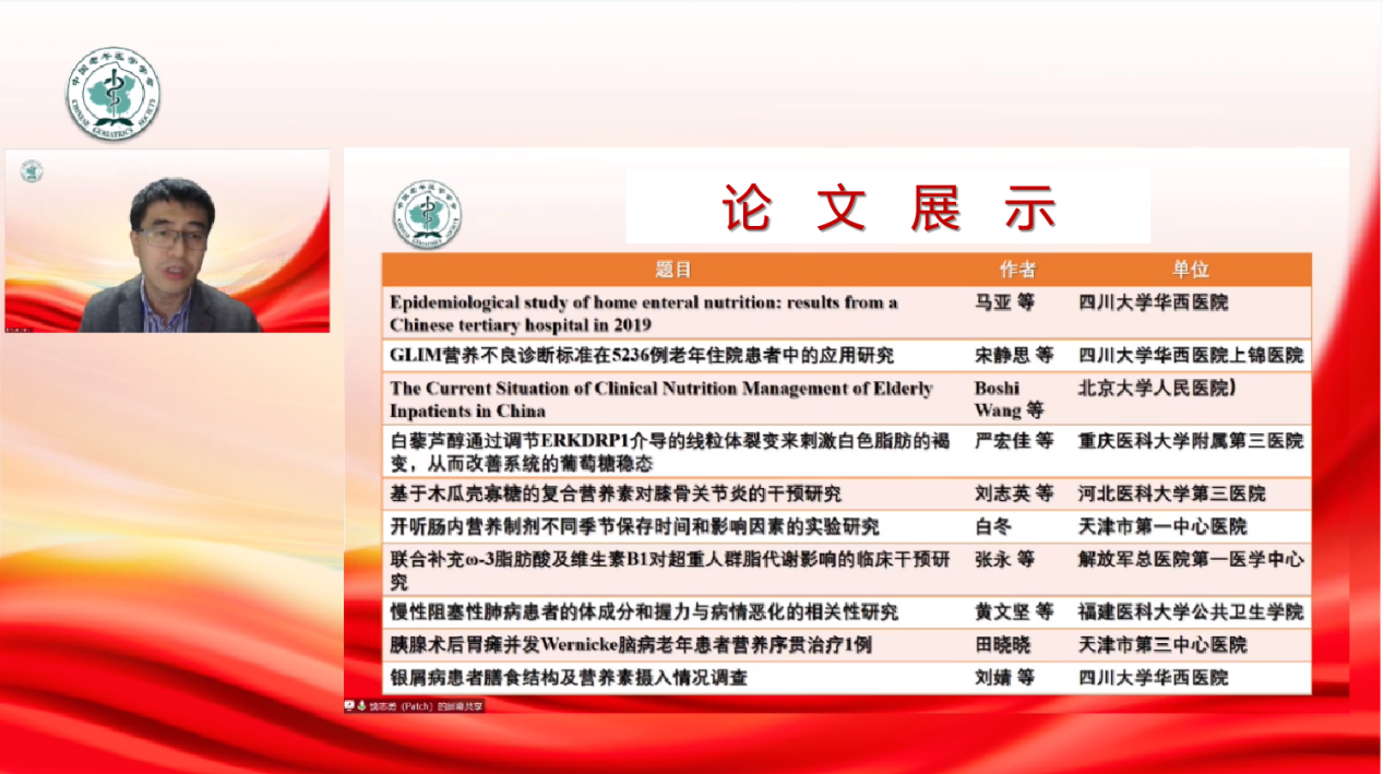 the keynote speakers of the conference focused on the national geriatric nutrition policies and management requirements, geriatric nutrition and mental health, geriatric nutrition and nutritional imbalance, metabolic diseases, gastrointestinal function and diseases, intestinal microecological management, healthy lifestyle, special medical food, therapeutic diet, co-morbidity, family nutrition and dietary management of the elderly, and other clinical frontier of geriatric nutrition. share insights and research progress. the conference also selected 10 papers from 41 submitted papers for exchange display.