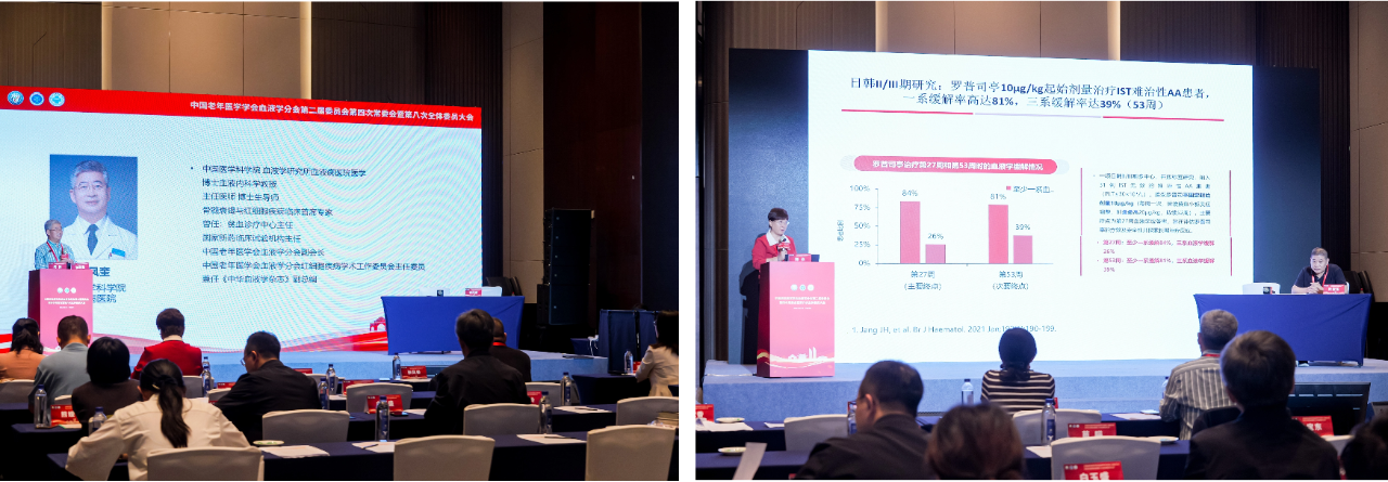 the special session on red blood cell diseases kicked off in a strong academic atmosphere, with professor zhang fengkui, vice president of the hematology branch of the chinese geriatrics society, delivering the opening remarks. professors han bing, sun zimin, wang fu 俤, xu gaixiang, feng xingmin, and zhao xin respectively presented on "advances in immunosuppressive therapy for aplastic anemia", "umbilical cord blood transplantation", "research advances related to iron metabolism", "therapeutic advances in paroxysmal nocturnal hemoglobinuria", "immune characteristics of bone marrow megakaryocytes in mouse models of aplastic anemia", and "autoimmune hemolysis" topics such as "progress in the treatment of anemia" were shared, and the academic discussion atmosphere on the spot was intense. experts had in-depth exchanges on core issues in the field of red blood cells, providing professional and rich reference ideas for the clinical diagnosis and treatment and scientific research innovation of red blood cell-related diseases in the elderly.